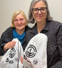 Jewish Family & Community Services Outreach Coordinator Lynne Azar donated Mitzvah Bags to Comfort & Hope on behalf of JFCS. The bags contained socks and hygiene products for underprivileged children in the area. Comfort & Hope was founded in 2005 by Wanda Marland. Marland and her team pack more than 600 birthday bags for children in need each year. Pictured from left are Marland and Azar.